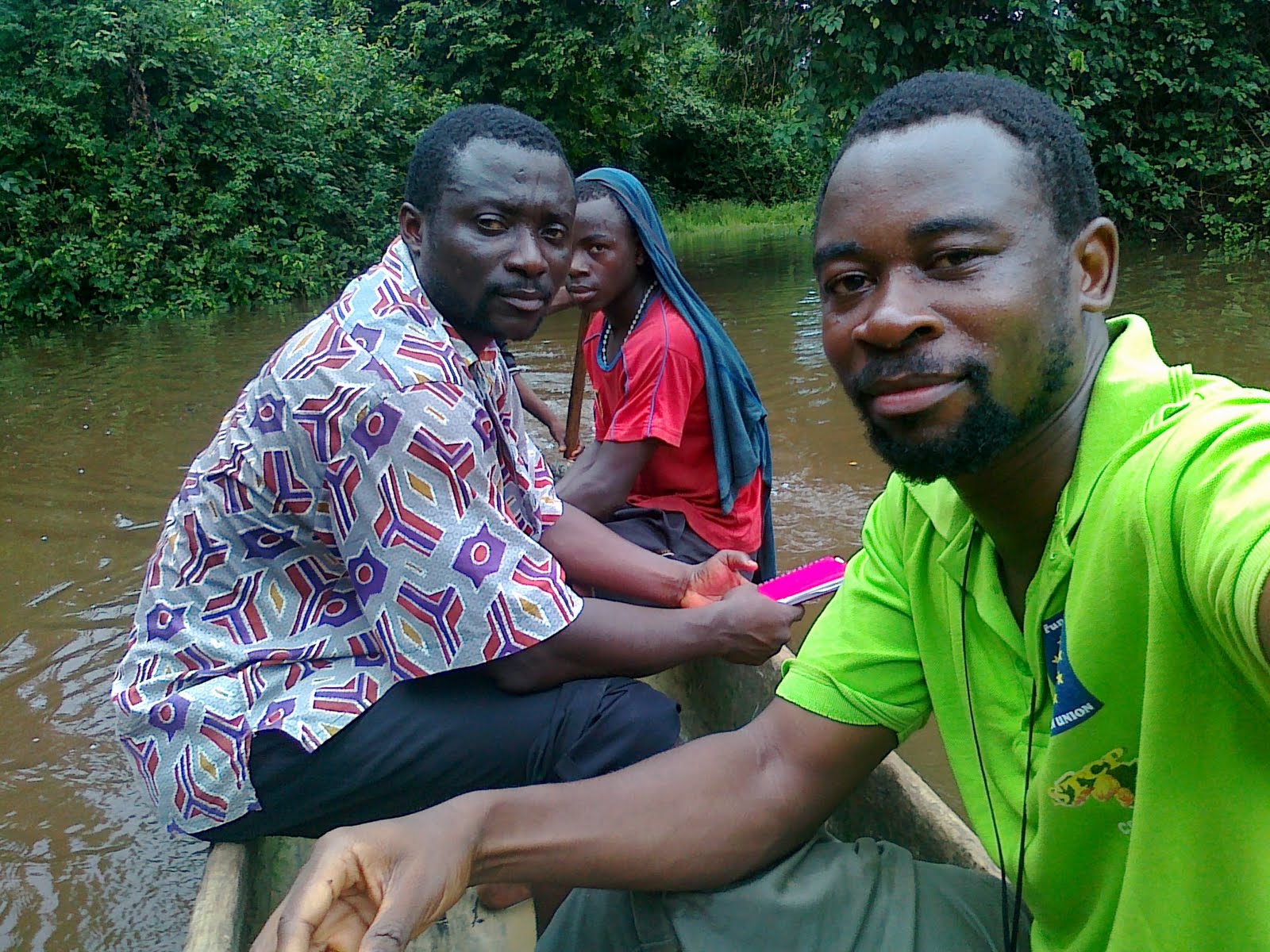 When we got to the crossing point, the canoe was on the other side. The guides hooted, a signal to check if someone was coming from the other side where the canoe/dugout was. If there were, the individual would hoot back. Silence meant there wasn't anyone coming and one of our guides swam across the river to fetch the dugout. We rowed to the other side and rowed back, wetting our shoes, trousers and more. I was very happy and scared at the same time, since this was my first time of crossing a river in a dugout. However, I did my best to suppress my fears. Once on the other side, we had to get into the forest by walking through muddy streams, barefooted.